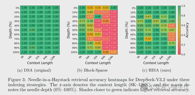 精度上,HISA也几乎完全保留原DSA的精度,且显著优于纯块稀疏方法。