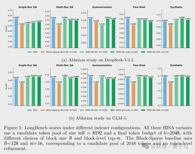 而在超参数测试中,不同块大小、选块数量下,HISA表现都很稳定,分数均与DSA高度接近,无显著性能差异