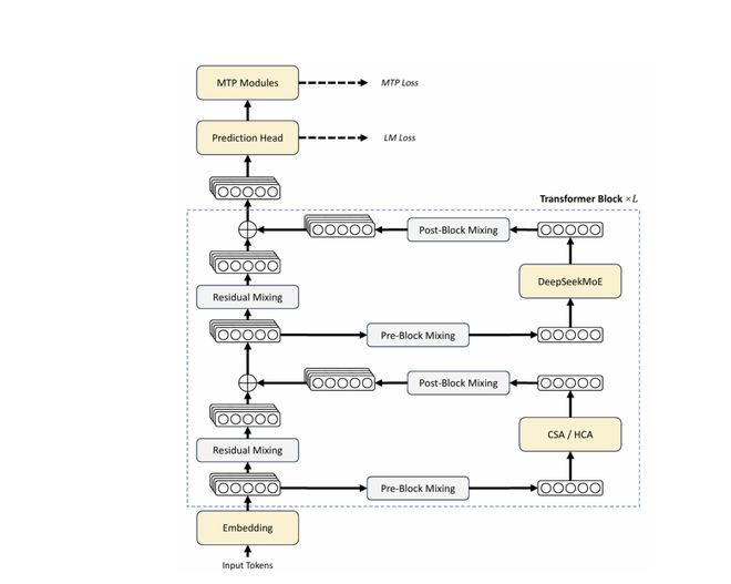 另一项重要的架构创新是流形约束超连接(mHC),用于增强模型内部的信息传输稳定性。混合注意力机制解决了“怎样看长文本”的问题,而 mHC 则处理了信息如何稳定地在模型内部传递的问题。