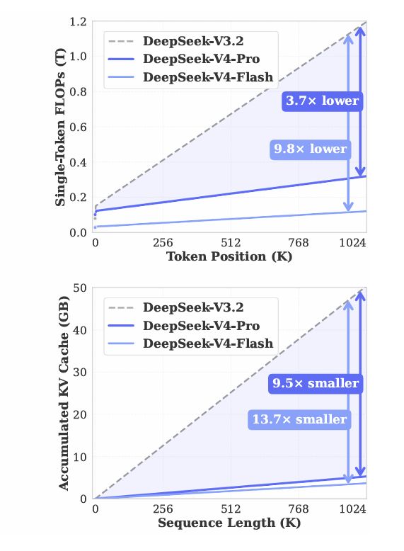 在百万Token的设置下,V4-Pro 的单token推理FLOPs仅占V3.2版本的27%,所需的KV缓存空间也仅为原来的十分之一。