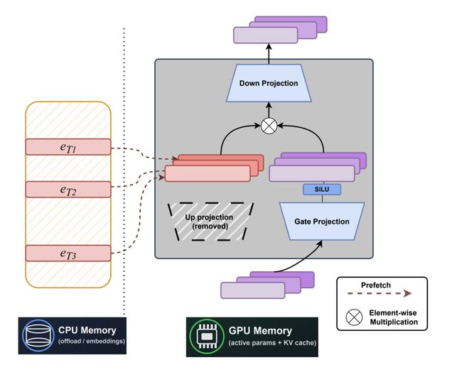 砍掉up-projection后,每一层都能省下庞大的矩阵乘法开销(约级别) 。更妙的是,庞大的embedding表完全可以离载(offload)到 CPU 内存中,配合异步预取(prefetch)和缓存策略高效运行 。