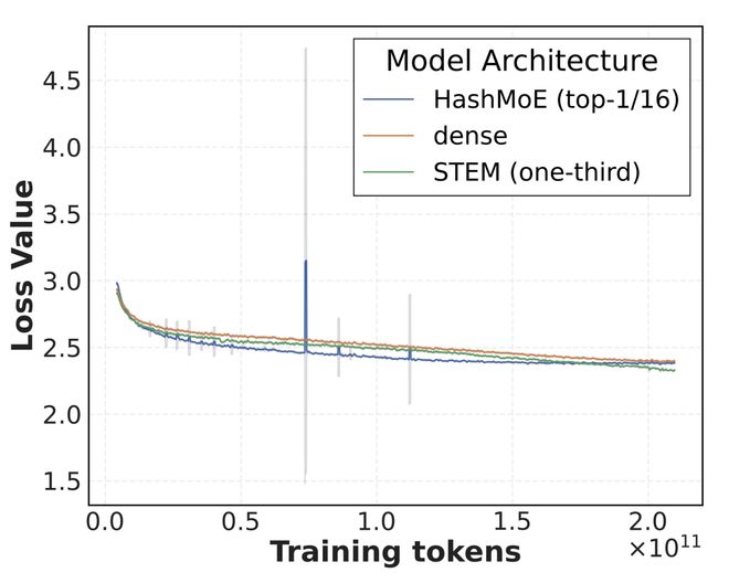 与依赖运行时路由的MoE不同,STEM是一种静态稀疏架构 。由于每个token在每一层访问的 embedding 都是恒定确定的,它完美避开了MoE训练中令人头疼的负载倾斜(load skew)和损失突刺(loss spike)问题,且不需要任何all-to-all通信 。