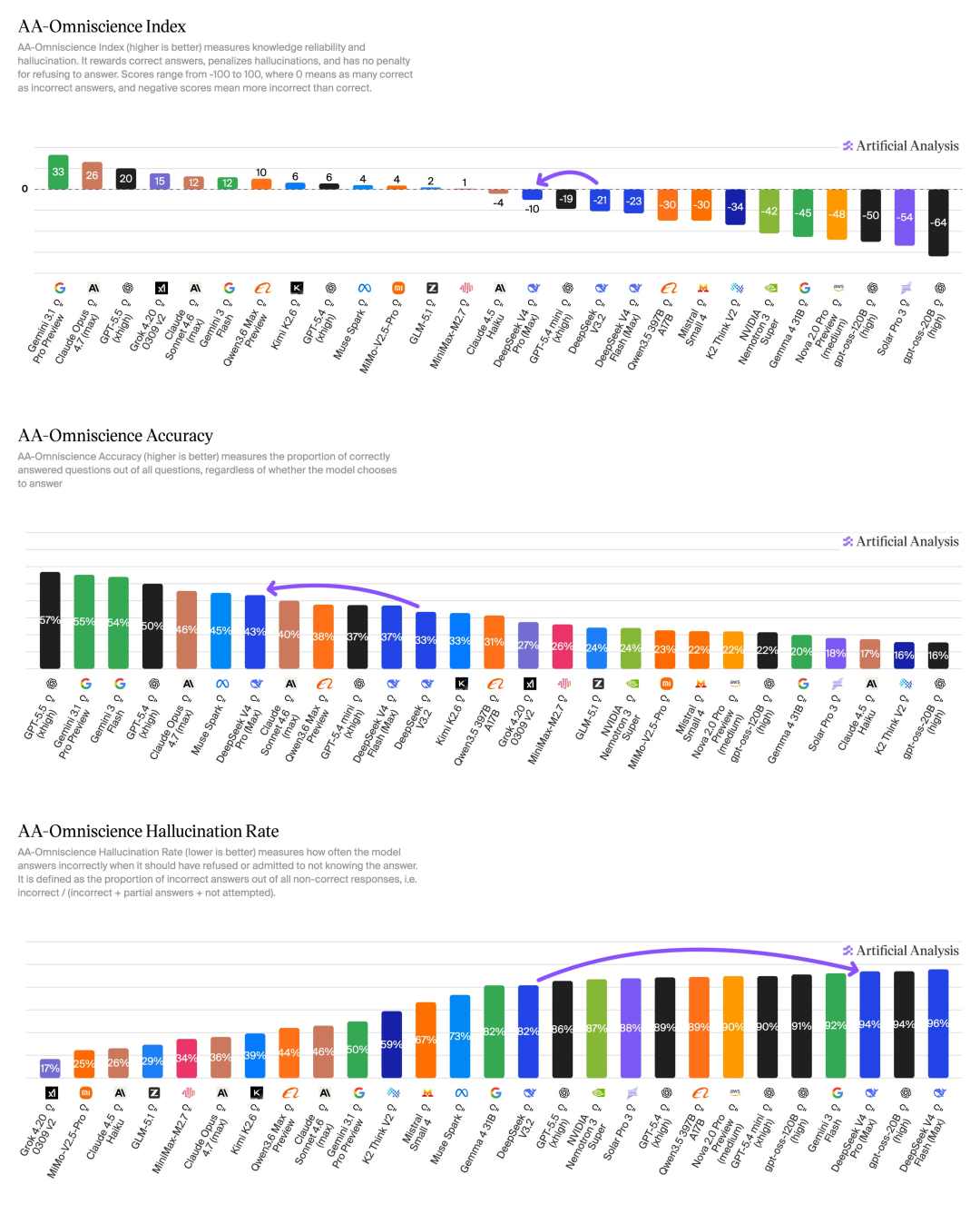 Aritificial Analysis的报告里也非常坦诚地指出了这种做法的代价:V4 pro在AA-Ominiscience上的幻觉率高达94%。