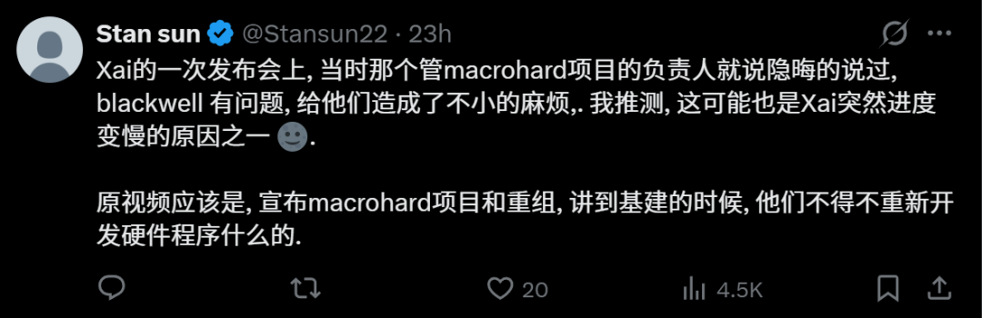 在一次发布会上,xAI透露说英伟达最新的芯片给他们带来了不小的麻烦,这也解释了一部分进度放缓的原因。