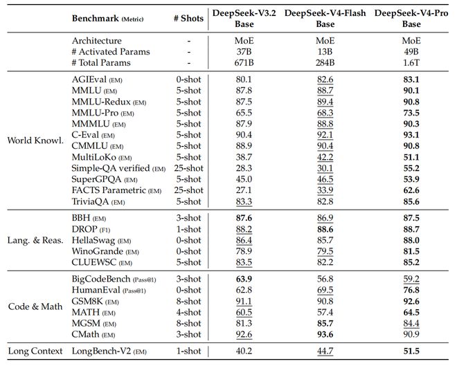 DeepSeek-V3.2、DeepSeek-V4-Flash和DeepSeek-V4-Pro的基础模型在统一的内部框架下进行了评测,获得以下结果。