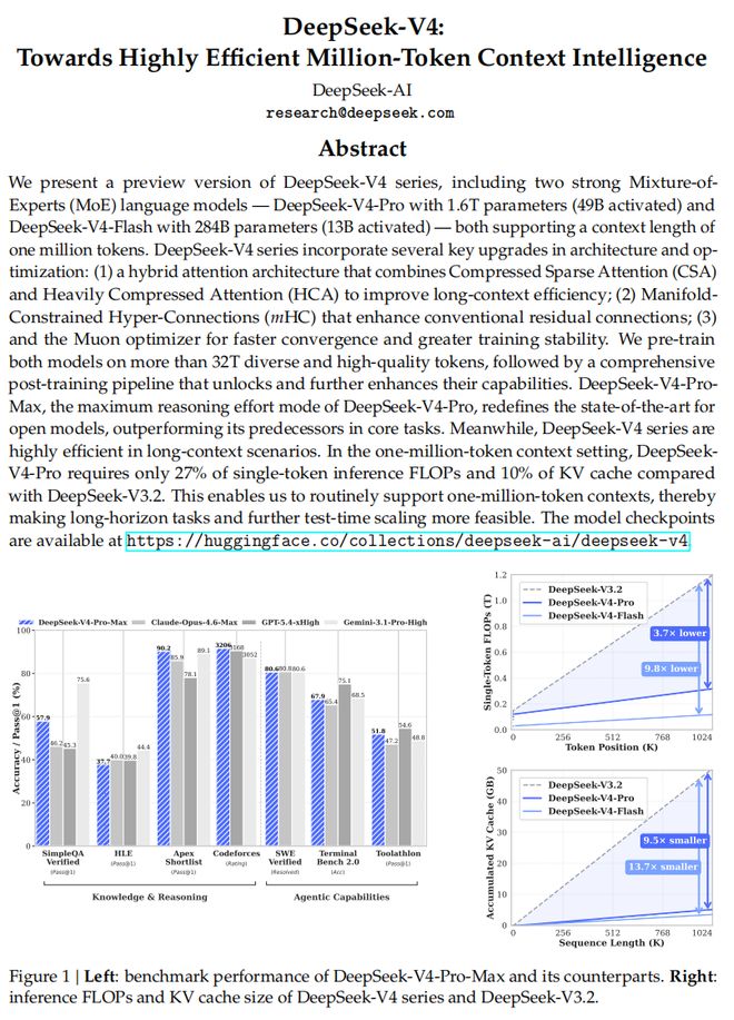 DeepSeek-V4系列预览版突破了超长上下文处理中的效率瓶颈,其通过融合CSA与HCA的混合注意力架构,并结合系统级基础设施优化,使模型能够更高效地支持百万token级上下文,为测试时扩展、长时序任务和在线学习等方向提供了基础。
