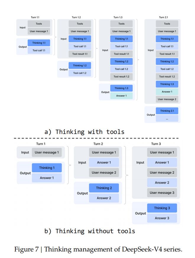 在一般对话场景中,DeepSeek-V4仍然保留原有策略:当新的用户消息到来时,会丢弃上一轮的推理内容,从而保持上下文简洁。