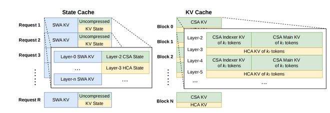 DeepSeek将FP4(MXFP4)量化应用于两个关键部分:第一是MoE专家权重,这部分是GPU显存占用的主要来源之一;第二是CSA中索引器的Query-Key(QK)路径,在该路径中,QK激活值的缓存、加载以及乘法计算全部在FP4精度下完成,从而在长上下文场景中加速注意力分数的计算。