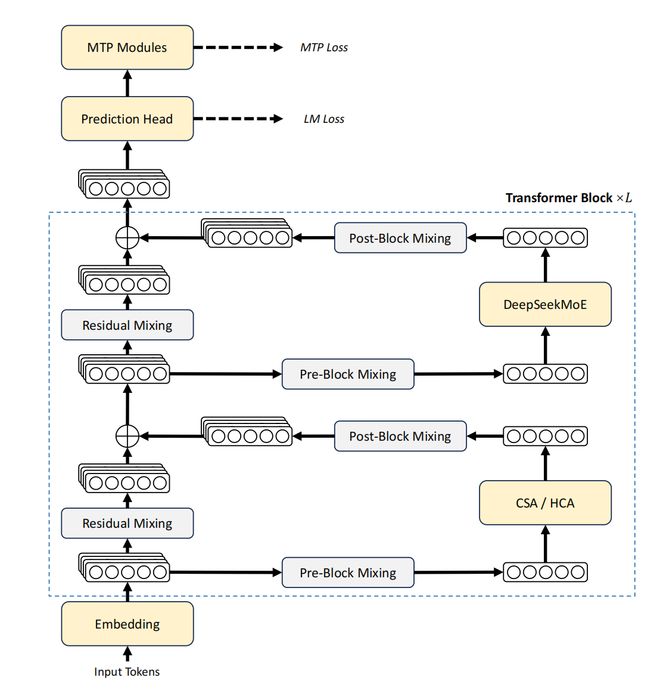 (1)采用混合注意力架构,将压缩稀疏注意力(CSA)与高压缩注意力(HCA)结合,以提升长上下文处理效率;