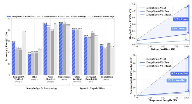 DeepSeek-V4在推理、知识获取和代码能力等关键领域均有显著提升,整体性能可比肩GPT-5.4和Claude Opus 4.6这些顶级闭源模型。此外,该版本首次以“百万上下文”作为默认配置,并在此设定下实现了单token推理FLOPs与DeepSeek-V3.2相比降低了73%,KV cache占用也仅为后者10%。