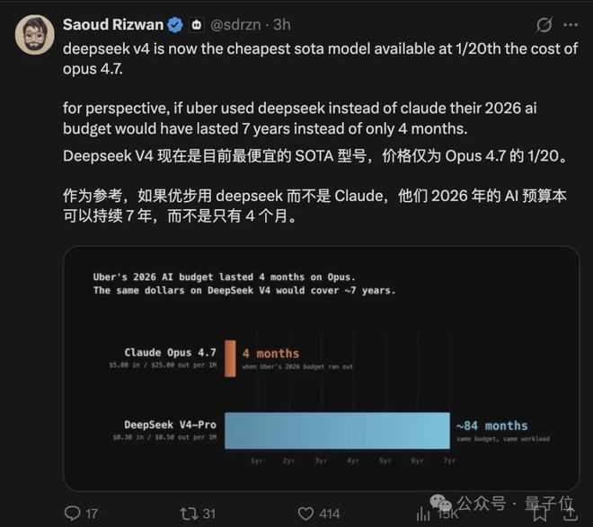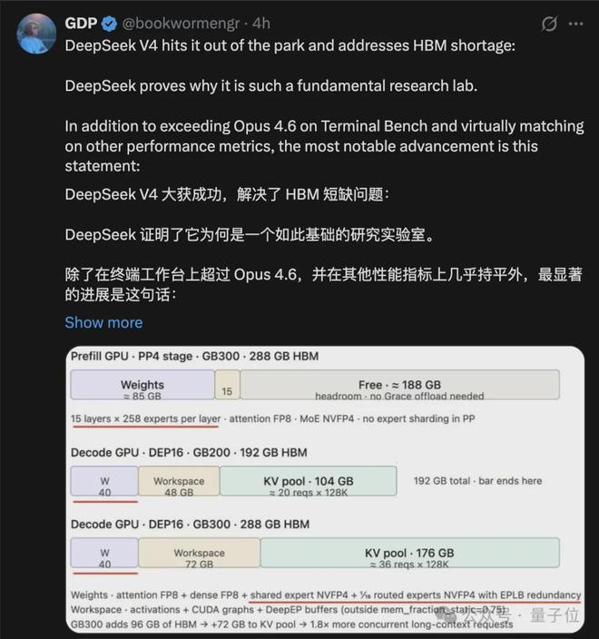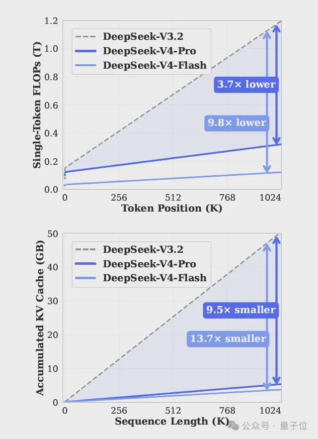 删到V4,单token推理FLOPs砍到四分之一,KV cache砍到十分之一。
