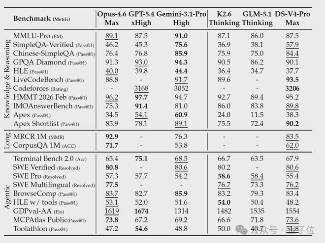 HLE上V4-Pro-Max 37.7,Gemini-3.1-Pro 44.4,Claude-Opus-4.6-Max 40.0。1M MRCR上V4优于Gemini但明显不如Claude。知识类和最前沿的推理任务仍有3-6个月的gap。