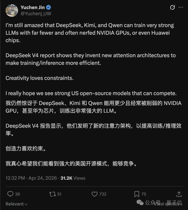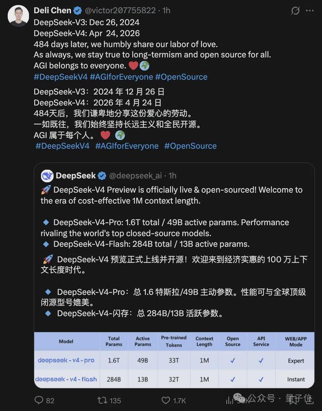 V4发布当天,DeepSeek研究员陈德里在x上转发并写道: