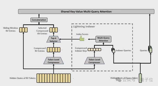 第二步,lightning indexer + top-k选择。这部分继承自V3.2的DSA。对每个query token,用一个轻量的indexer计算它和每个压缩KV块的相关性分数。