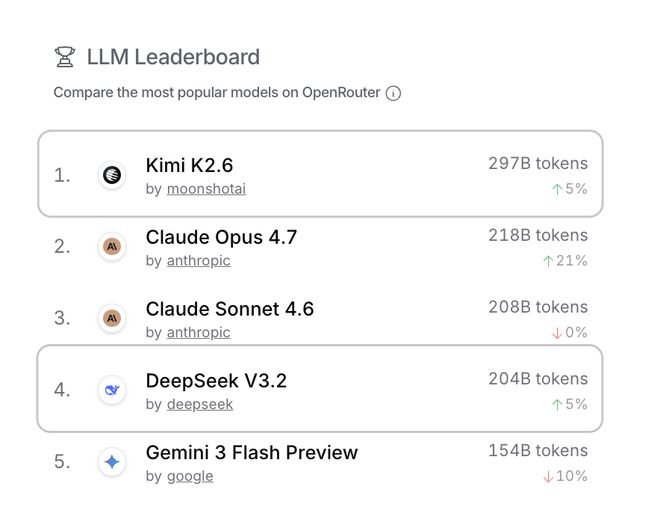 今天的OpenRouter调用量排行榜上,Kimi K2.6以297B tokens排名第一,DeepSeek V3.2以204B tokens排名第四。