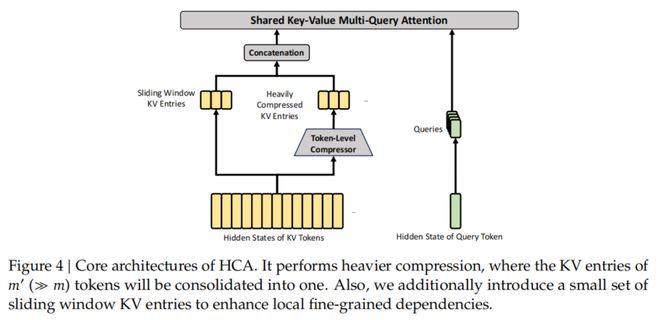 DeepSeek V4这次接过了这根棒,设计了CSA(压缩稀疏注意力,每4个token的KV合并后再做top-k选择)和HCA(重压缩注意力,压缩率128倍但保持全局稠密计算)交替堆叠,推理算力降到V3.2的27%,KV缓存只剩十分之一。