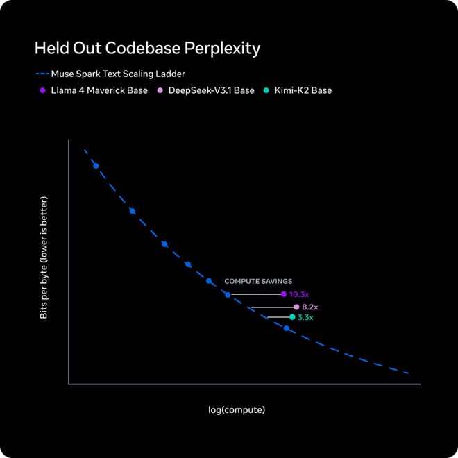 在代码困惑度对比图中,用来对标的外部模型,就是Llama 4 Maverick、DeepSeek-V3.1 Base和Kimi-K2 Base。