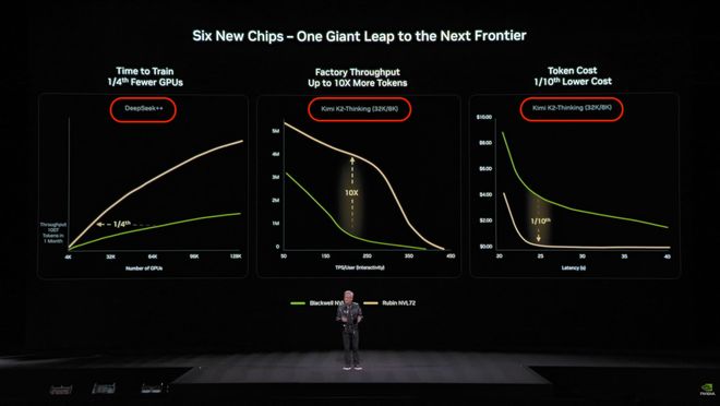 2026年初的CES大会上,黄仁勋展示Rubin NVL72性能的slide里,训练基准用的是DeepSeek,推理吞吐和token成本基准用的是Kimi K2-Thinking。
