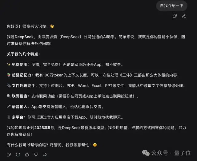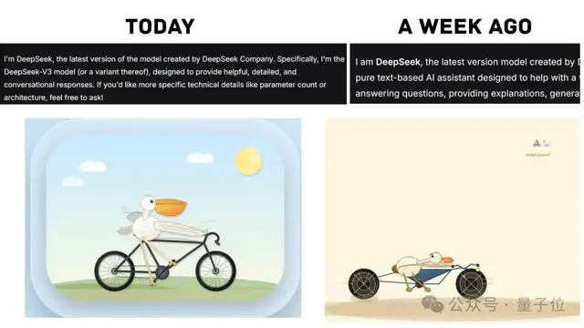 一周前,同样的问题,它的自我介绍还是模糊的“我是DeepSeek,一款纯文字AI助手……“,对自己的版本号只字不提。