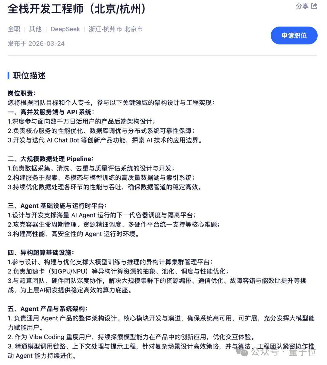 从当前发布的招聘岗位来看,DeepSeek已经从研究阶段过渡到实际的产品能力建设阶段。