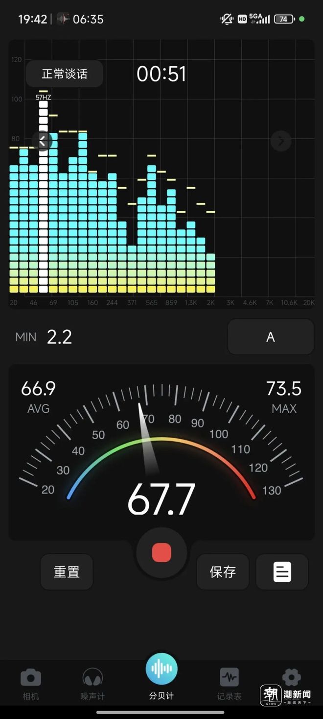 其中一款名为“精检分贝仪”的APP的测试结果显示,平均分贝为56分贝,最大值为73分;另外两款检测仪测试的平均值和最大值,分别为61.4分贝和79.9分贝,以及66.9分贝和73.5分贝,其平均值也均高于2类声环境功能区的昼间限值。