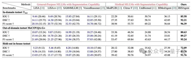 相较于医学专用MLLM基线,平均IoU提高了35.13%,DSC提升了37.58%,F1得分上升了29.79%。