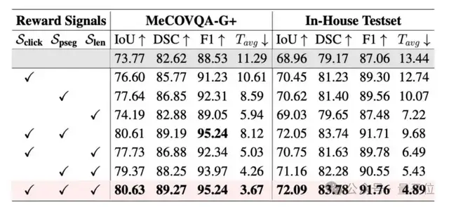 细粒度奖励设计的消融实验证明,在域外集MeCOVQA-G+上的IoU从使用基础奖励时的73.77提升到加入区域点击奖励后的76.60,进一步引入渐进式分割改进后跃升至80.61。