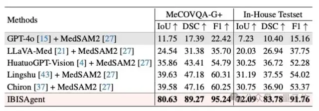 与依赖MedSAM2工具增强型代理(如GPT-4o、LLaVA-Med 和 HuatuoGPT-Vision)相比,IBISAgent在测试集上仍占据显著优势,充分展示了多轮交互推理的重要性。