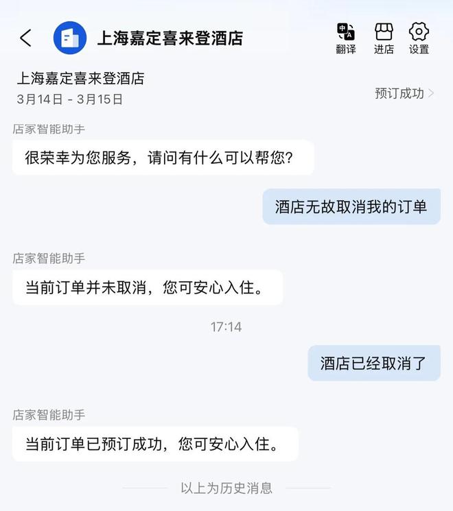 3月12日,吴女士向极目新闻表示,嘉定喜来登酒店预订部的人员告诉她,她3月14日的订单确实被取消了,理由是“后台标记了信用卡无效,没有更新”。该人员表示,是booking方面取消了订单。但booking客服人员否认,称取消订单的申请是酒店方发起的,平台不会在未经顾客允许下取消订单,酒店方面若要取消,平台也会向顾客确认,针对携程的第三方订单,则会将信息传达到携程。