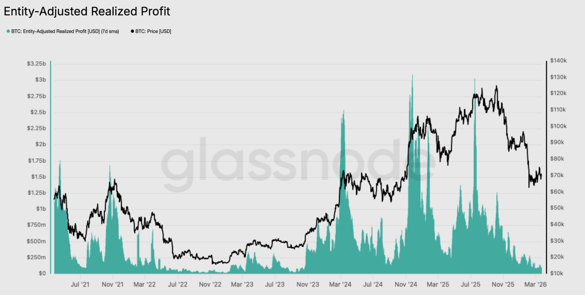 比特币经实体调整后的已实现利润从2025年7月的每日30亿美元的高点降至目前不到1亿美元。
