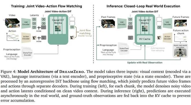 DreamZero 的核心在于:在一个单一的架构中预测未来的视频和机器人的动作。这意味着在采取行动前,机器人可以在内部模拟未来的情境。
