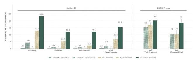 这是一个尚未达到性能上限的新基准,意味着模型之间仍存在明显的差异,并且还有很大的提升空间。DreamZero 在这一系列测试中都表现出色。