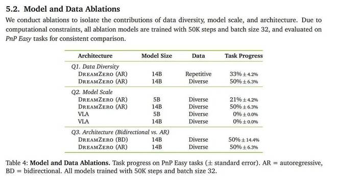 DreamZero 是一个庞大的模型,论文中很大一部分工作集中在如何让这个巨大的模型实现实时运行。消融实验表明,增加模型规模对性能表现有显著影响。