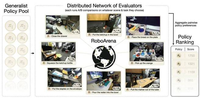 RoboArena 是一个基于 Droid 平台的真实世界评估框架。它汇集了来自世界各地的不同机器人和实验设置,并根据自然语言指令运行一系列开放式的机器人任务测试。