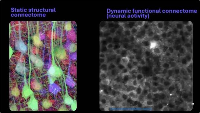 第一件是结构,也就是大脑里每一个细胞的位置,以及它们之间是如何连接的。这部分依赖高分辨率扫描技术,把神经元和突触一层层重建出来。