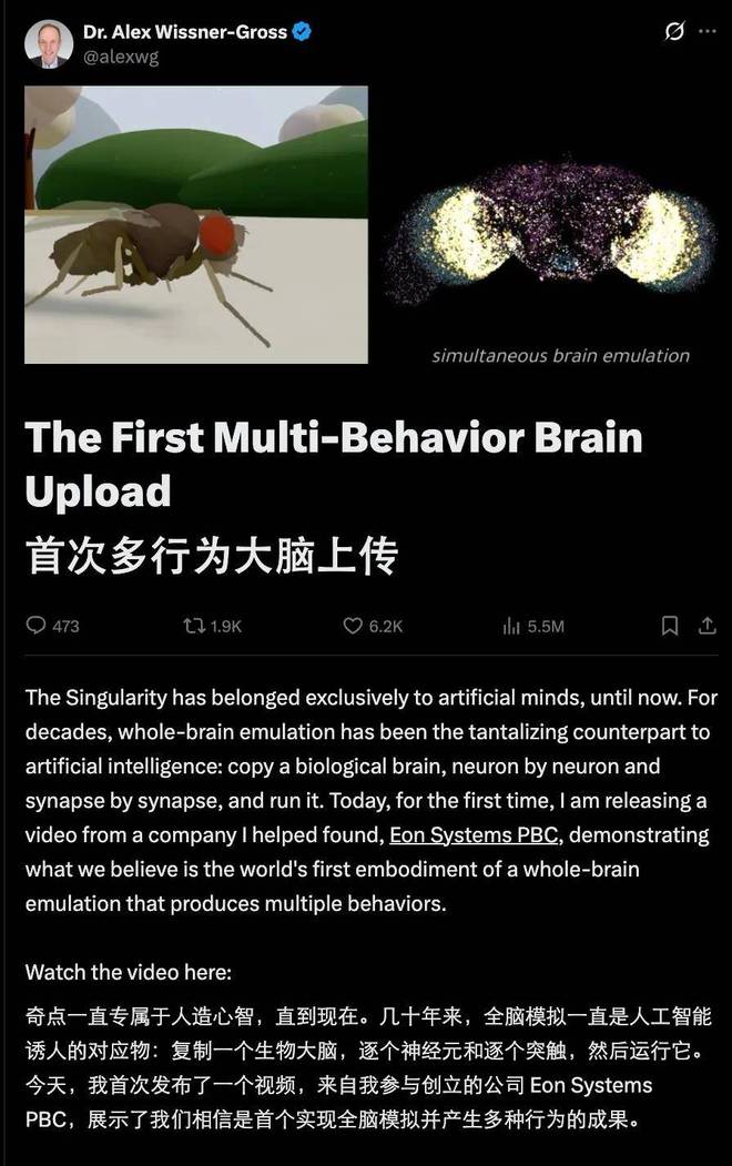 从 Eon 的角度看,这个实验其实不仅仅是一个果蝇模拟器,而更像是一次关于「心智上传」的早期验证。
