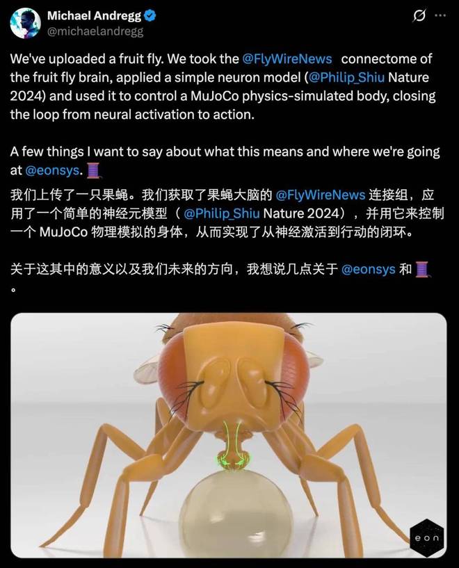 这一想法由硅谷一家名为「Eon Systems」的公司正在探索。该公司最近宣布成功地对果蝇大脑进行了全脑仿真,并让这个模拟出来的神经系统控制了一个虚拟的身体。