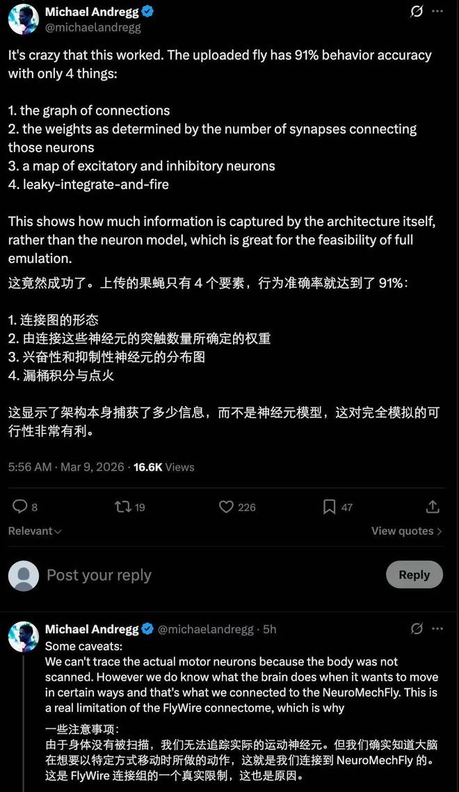 公司创始人 Michael Andregg 认为这项实验不仅仅是对果蝇行为的模拟,更是对未来人类意识上传可能性的一次初步验证。