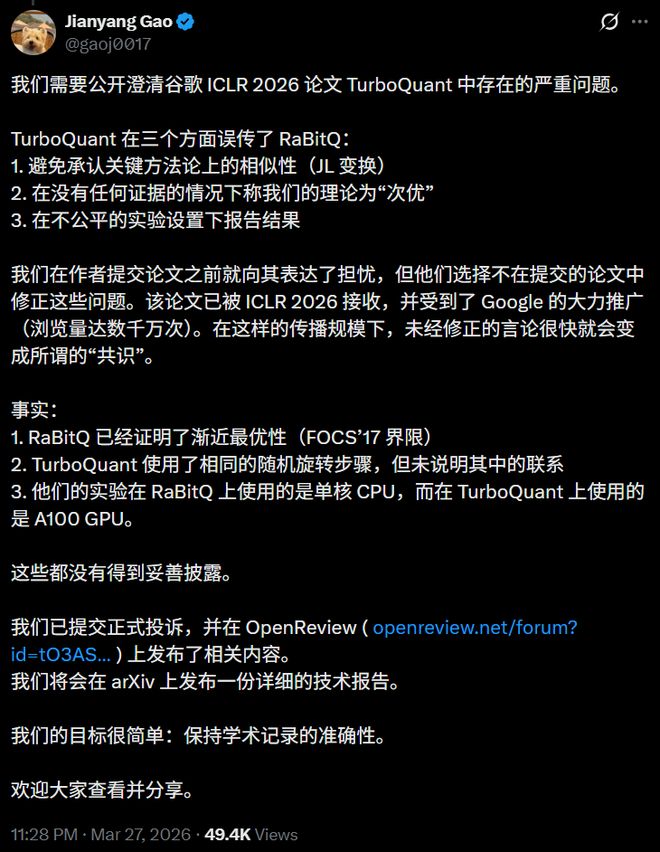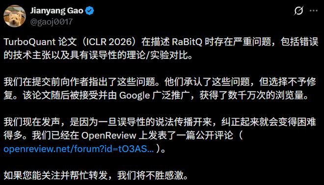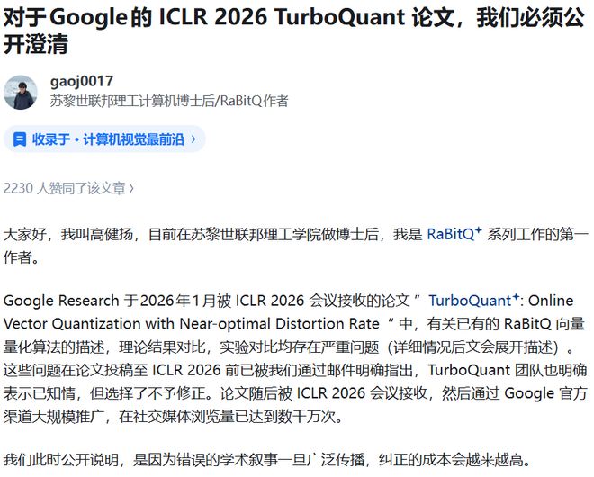 2026年3月,高健扬团队正式致信TurboQuant全体作者要求纠正。