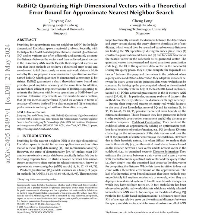 早在2024年5月,高健扬团队就在arXiv上发布了RaBitQ。