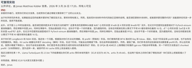 3月26日,研究者Jonas Matthias Kübler在OpenReview上发布公开评论,对TurboQuant的实验方法提出了多个具体质疑: