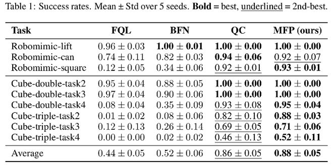 MVP 实现了从噪声直接映射到动作的极致单步生成,彻底消除了迭代计算开销。在 Robomimic 和 OGBench 等高难度具身智能基准测试中,MVP 不仅取得了 SOTA 的成功率,还在训练和推理速度上实现了显著的提升。
