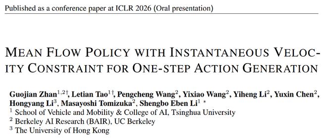 清华大学智能驾驶课题组 iDLab 和加州大学伯克利分校人工智能研究院 BAIR 在 ICLR 2026(口头报告,Top 1%)联合发表的研究成果《Mean Flow Policy with Instantaneous Velocity Constraint for One-step Action Generation》突破了生成式强化学习的效率与质量瓶颈,实现了最快最好的单步动作生成。这项研究由清华大学的博士生占国建和陶乐天在李升波教授的指导下完成。