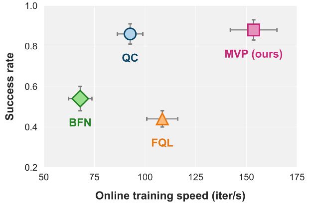 训练速度:相比于需要多步去噪计算的 QC、FQL 和 BFN,单步生成动作的 MVP 的在线训练吞吐量(iter/s)提升了超过 50%。