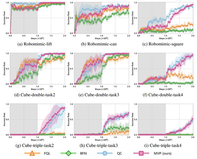 1. MVP 在绝大多数任务上都取得了 SOTA 性能。特别是在长视距、高难度的方块错位重排任务中,MVP(粉色)表现出更快的在线收敛速度和更高的最终性能。