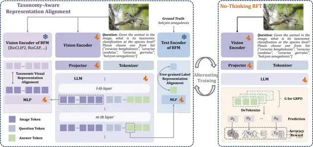 2. 自由粒度类别表征对齐:通过将大模型输出答案的首个词元表征与经生物基础模型编码后的真实类别表征对齐,促进大模型将具备完整类别树结构的视觉表征映射为对应层次的类别名称。