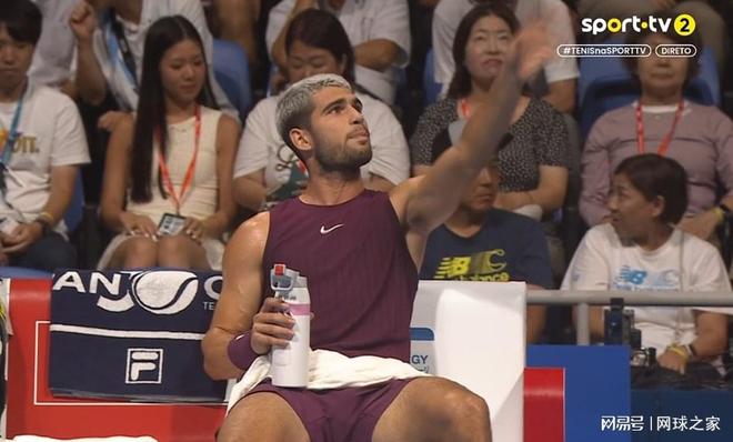 此次让阿尔卡拉斯不满的原因是他在发球前想用毛巾擦汗却被判罚超时,这令他相当不悦,并当场向裁判表示:“既然如此,那我就不拿毛巾了。”