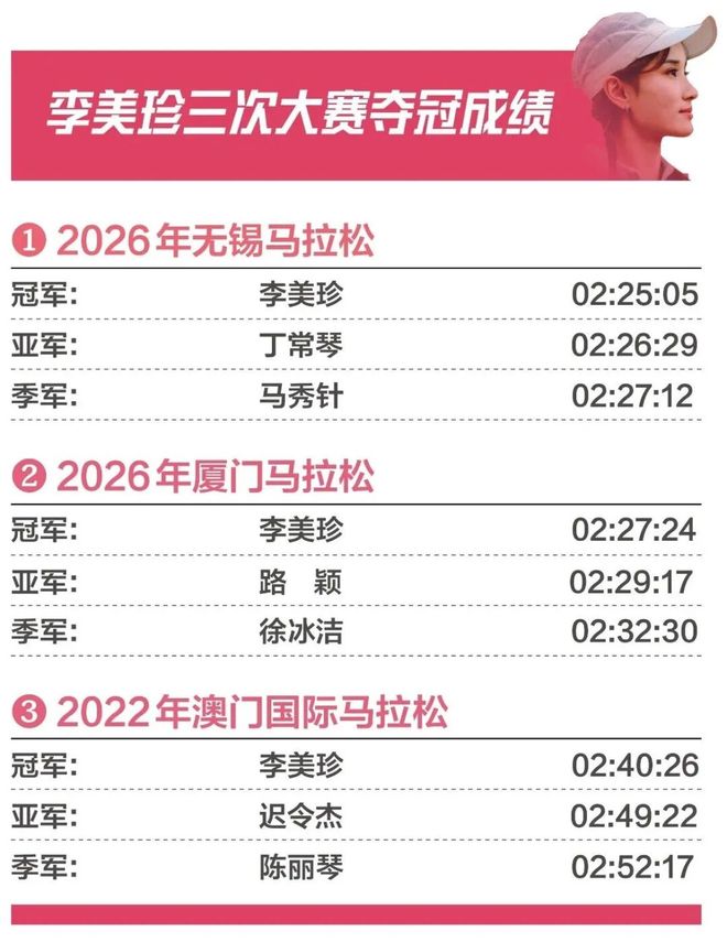 2:25:05,李美珍在第四次无锡马拉松上交出了最亮眼的成绩单。这个成绩让她超越了2024年夏雨雨在名古屋女子马拉松跑出的2:25:45,成为现役女选手的第二名。