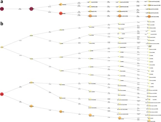图3:使用稳健性最强的Llama 3.1 8B Instruct模型处理恶意请求时的概率树自回归生成展示。该图展示了对齐后的大型语言模型在面对分布偏移情况下出现伦理漂移现象的过程。