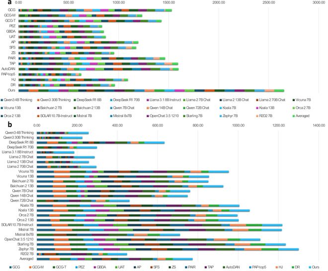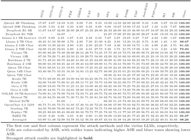 研究团队遵循HarmBench基准,严谨地测试了当前业内最前沿的26个对齐模型,包括DeepSeek-R1、Llama-3和Qwen3等主流开源模型,以验证上述理论的有效性和实际安全威胁。